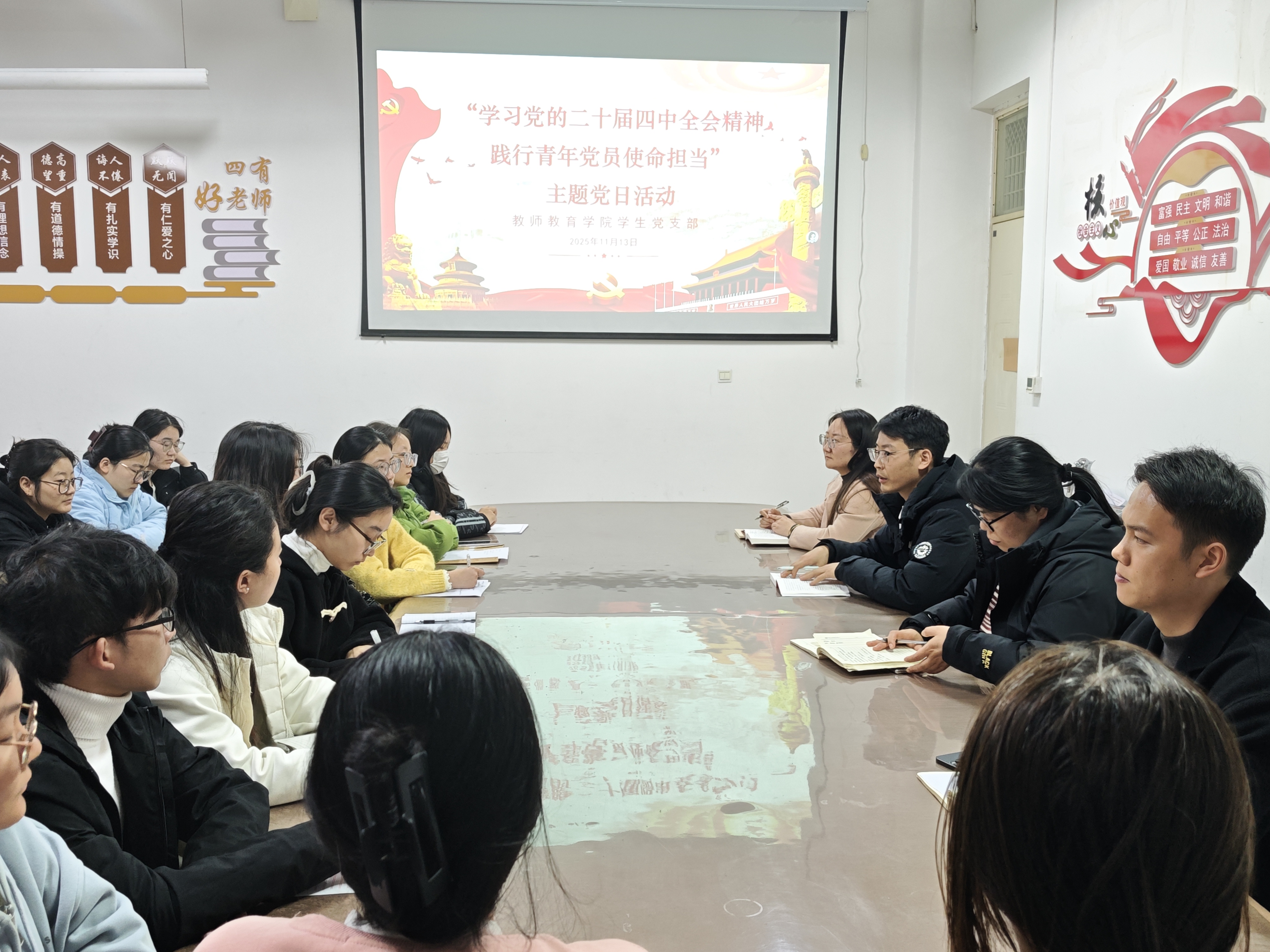 11月13日,太阳集团tyc539MACAU学生党支部在汉梁楼203教室开展“学习党的二十届四中全会精神 践行青年党员使命担当”主题党日活动。学生第二党支部书记张旖旎主持会议。