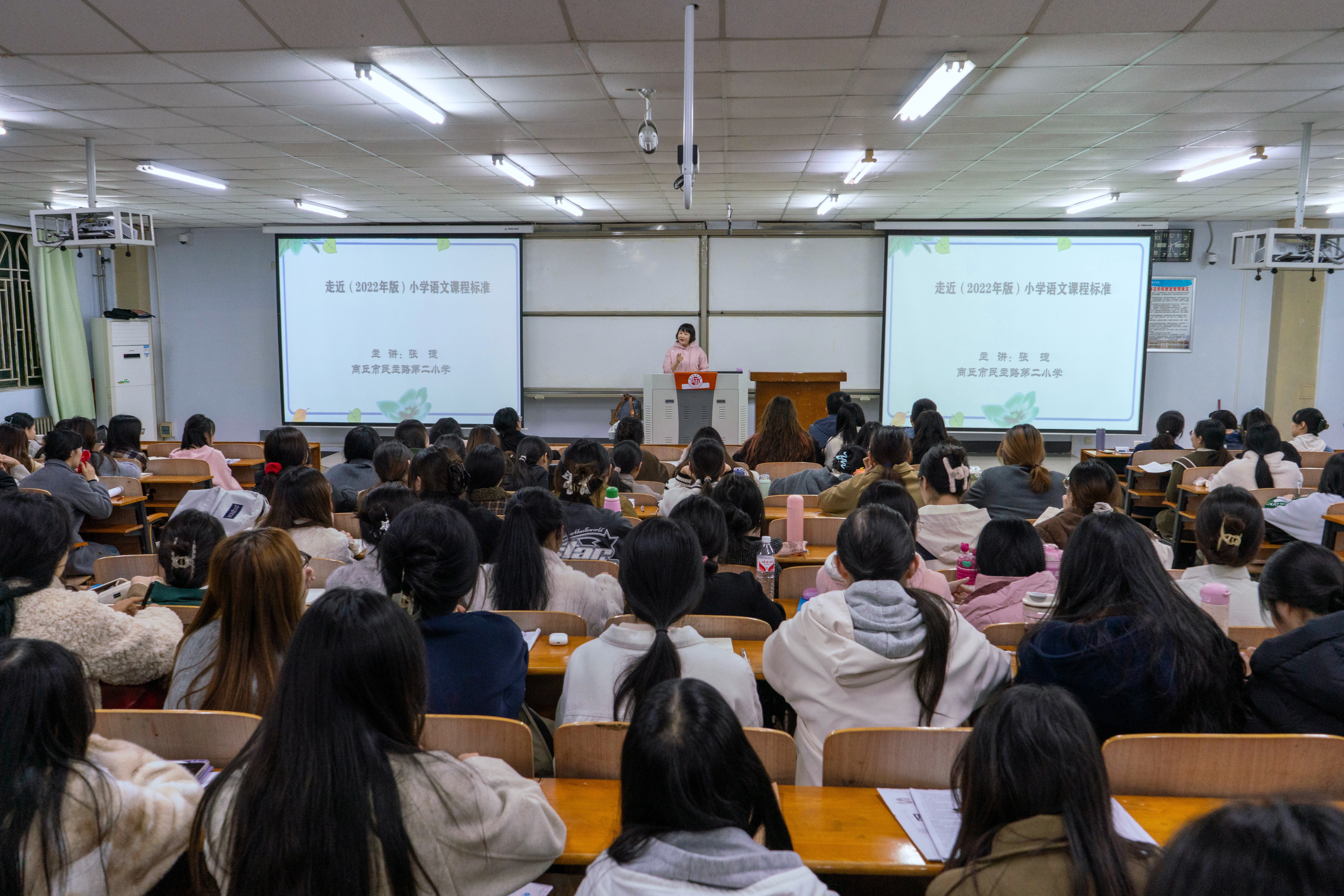 讲座中,张捷以其深厚的专业素养和丰富的教学经验,围绕语文核心素养的构建与语文学习任务群的设立两大核心议题,进行了深入浅出的讲解。她着重强调了语文实践活动的重要性,特别是语文情境教学的独特价值。张捷结合大量生动、具体的教学案例,对课标内容进行了全面而深刻的解读,从核心素养的起源、演变讲到其本质内涵的揭示,再讲到核心素养视域下对语文学习任务群的理解、分类以及教学设计,为师范生们勾勒出了未来小学语文教学模式转型的宏伟蓝图。