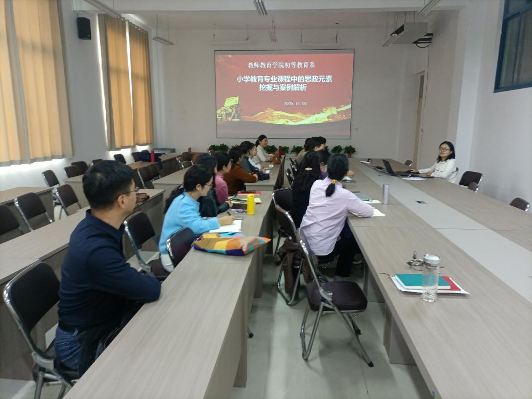 为深入贯彻落实立德树人根本任务,全面推进课程思政建设,提升小学教育专业人才培养质量,2025年11月7日下午,初等教育系在汉梁楼334会议室成功举办了以“小学教育专业课程中的思政元素挖掘与案例解析”为主题的教学研讨活动。本次活动由学系主任王丽主持,小学教育专业全体任课教师齐聚一堂,共同探讨课程思政的深层内涵与实践路径,旨在将价值塑造、知识传授与能力培养融为一体,筑牢师范生培养的育人主阵地。