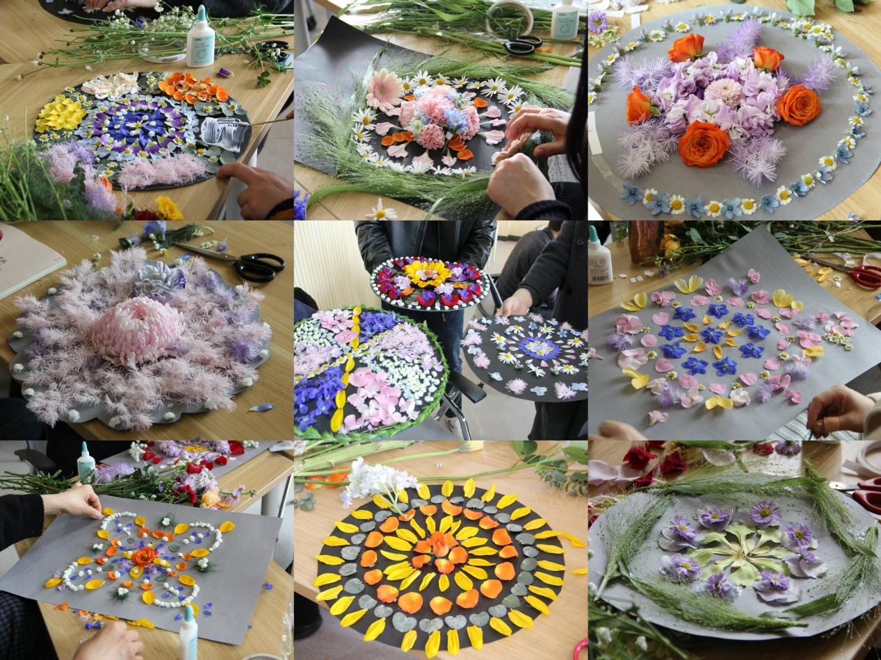 进入创作阶段,老师们以花为媒,在张老师的引导下充分发挥创意,将内心情绪与感悟融入作品。大家围绕秩序与对称精心构思、动手创作,每一件鲜花曼陀罗作品都风格迥异、独具个性,尽显教师们丰富的内心世界。