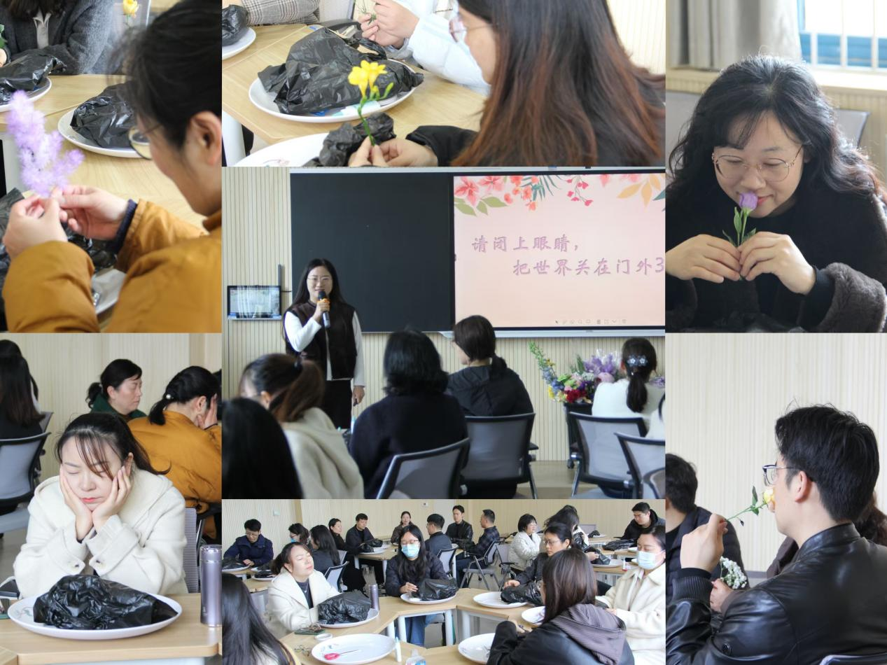 在正念感知环节,老师们闭上眼睛,通过触摸、嗅闻探索黑色塑料袋内的鲜花物料,在静默中回归当下,完成与自我的深度联结。