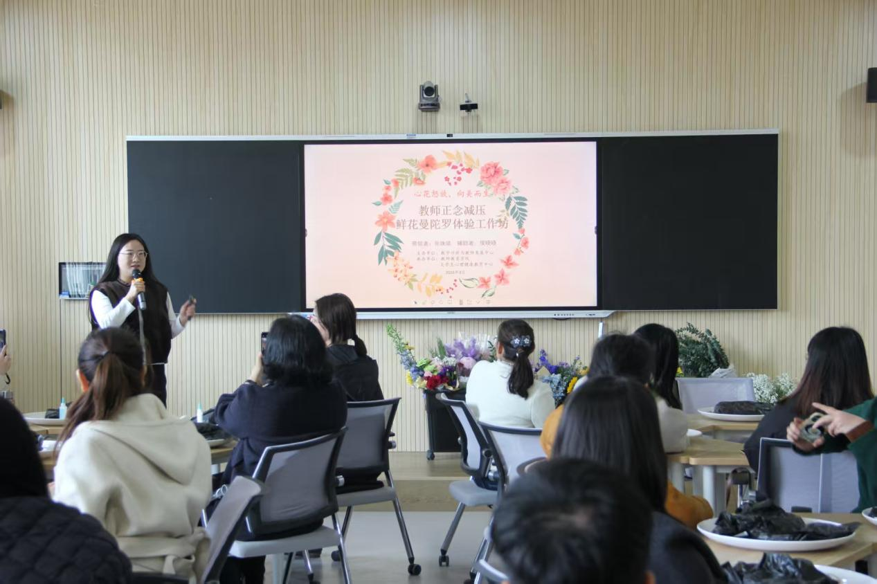 3月13日上午,由教学评价与教师发展中心主办,太阳集团tyc539MACAU教师教学发展分中心、心理健康教育中心承办的“心花怒放,向美而生”教师正念减压鲜花曼陀罗体验工作坊在汉梁楼105顺利开展。活动特邀国家二级心理咨询师、大学生心理健康教育中心专职教师张姝婧博士主讲,太阳集团tyc539MACAU李战营副院长主持,40名教师参与体验。