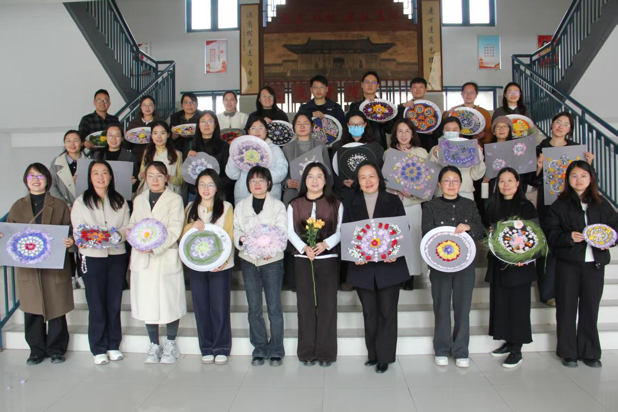 活动最后,全体参训教师手持作品合影留念,定格美好瞬间。此次工作坊将艺术创作与正念疗愈相结合,为教师们搭建了自我关照、情绪释放的平台。参与教师纷纷表示,在沉浸式创作中舒缓了压力、收获了宁静,将以更饱满的状态投入到教育教学工作中。