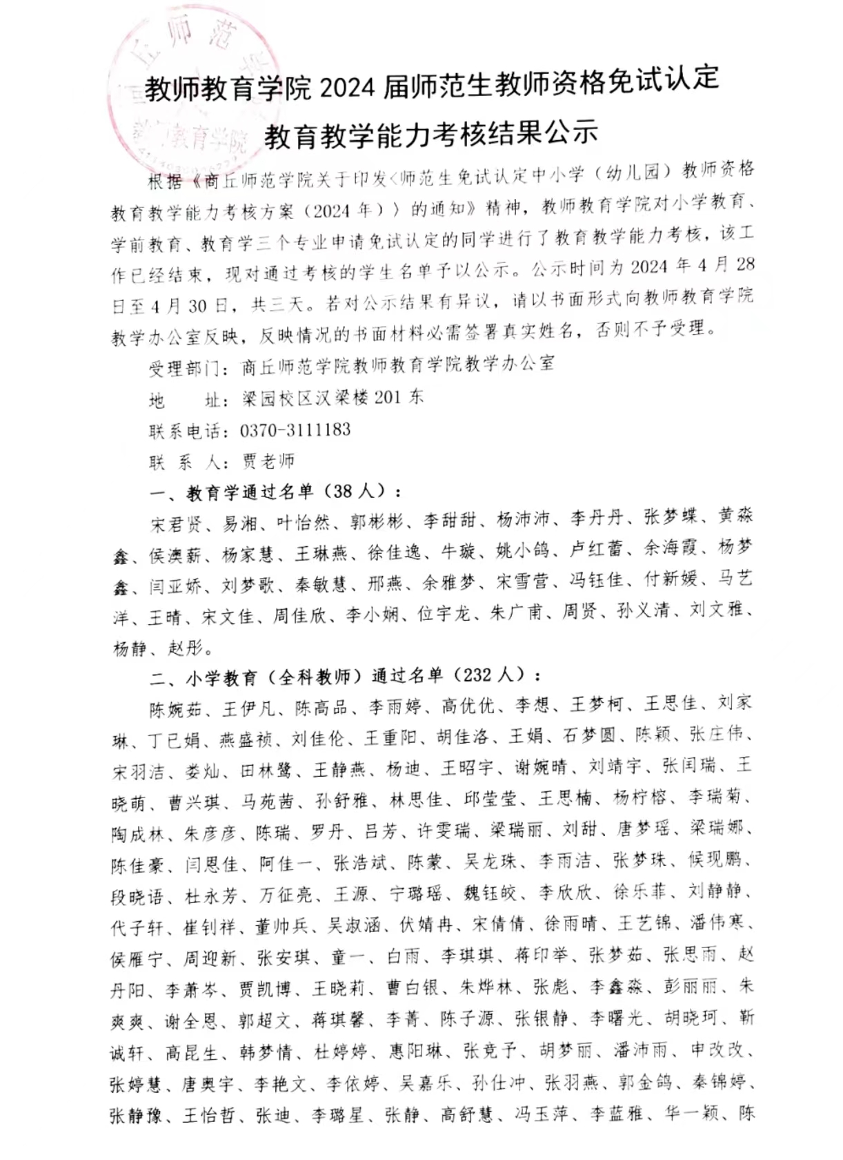 太阳集团tyc539MACAU2024届师范生教师资格免试认定教育教学能力考核结果公示